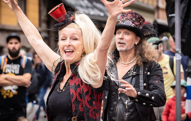 The Street Show has a structure and form but it´s mainly based on improvisation with the spectators and the environment. And its framed by their Steam punk costumes and chairot.